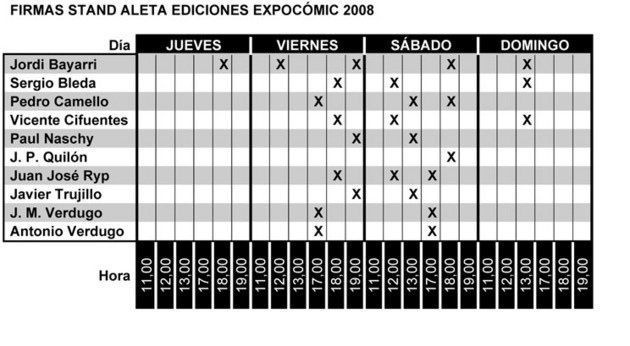 Presentación Entre Tinieblas: Oculto en las entrañas Ponentes: Jordi Bayarri, Joseba Basalo Día: 29 de noviembre, sábado Hora: 16:00 horas Lugar: Escenario Expocómic 2008. Además, os adjuntamos el horario de firmas de los autores que os copiamos aquí): -Jordi Bayarri (Entre Tinieblas) Comenzó su carrera en el mundo del cómic junto con el colectivo 7 Monos y su obra más conocida, Magia y Acero, serie que sigue realizando actualmente y que ganó el premio al mejor cómic erótico en el Saló del Cómic de Barcelona. Después de realizar Titán del Pasado para Aleta, comenzó una gran saga de fantasía con la novela gráfica Piel de Dragón y su continuación en forma de serie regular Entre Tinieblas, cuyo número 5 es novedad para Expocómic. Continúa también su propia web de cómic porno on-line llamada Enchantae. -Pedro Camello (Treyes, Guido el Negro) Comenzó a trabajar en el mundo de la animación, en la producción “¡Qué vecinos tan animales!” ganadora de un Goya en 1998. Tras ello se dedicó varios años a dar servicios como animador en numerosas producciones para cine y televisión. Debutó en el mundo del cómic en el mercado independiente americano con el guionista Damon Hurd en “My uncle Jeff” (Alternative comics) en 2003, obra nominada al premio Eisner de ese mismo año. En España ha publicado con Aleta Ediciones la saga fantástica “Treyes” con guiones de Eduardo Cubera y “Guido el negro”, obra de la que está a punto de ver la luz su segunda parte “Destino de sangre”, también para Aleta. -Eduardo Cubera (Treyes) No se ha prodigado mucho en el mundo del cómic, siendo la saga “Treyes”, con dibujos de Pedro Camello, el único cómic que ha escrito. -Jose Manuel Verdugo (Brids, Sword) Autor de la serie Brids para Aleta (dos números publicados) cuyo trabajo también se ha podido ver en la revista de fantasía Sword en su cuarta época. -Antonio Verdugo (Sword) Actualmente ayudando a su hermano Jose Manuel en la serie Brids para Aleta, Antonio Verdugo ha realizado varias historias cortas para la revista Sword. -Javier Trujillo (Los Mitos de Asturdeva, Waldemar Daninsky) Después de muchos trabajos en el mundo de la publicidad, Javier Trujillo decide dar el salto al mundo del cómic con Los Mitos de Asturdeva, para después comenzar a realizar adaptaciones de las películas del mítico Paul Naschy, como El Retorno del lobo (Aleta). -Paul Naschy (Waldemar Daninsky) Mítico director, guionista y actor de cine fantaterrorífico español, con más de 100 películas a sus espaldas, la adaptación de la película "Waldemar Daninsky: El retorno del Hombre Lobo" al cómic supone un paso más en la increíble carrera de Paul Naschy. -Sergio Bleda (El baile del vampiro) Historietista e ilustrador con una larga carrera a sus espaldas, Sergio Bleda se dio a conocer al gran publico con su obra “El baile del vampiro” (cuya reedición ha corrido a cargo de Aleta), y su obra puede leerse en más de 7 idiomas, aunque es el mercado francés quién disfruta ahora de su trabajo. -Juan José Ryp (Frank Miller´s Robocop) Después de comenzar su carrera en España Juan José Ryp dio el salto al mercado estadounidense donde no ha dejado de trabajar para la editorial Avatar Press, donde realizó la serie Frank Miller’s Robocop recopilada por Aleta para el mercado español. -Juan Pedro Quilón (Futuro Imperfecto) Miembro fundador del colectivo 7 Monos y donde ha publicado la mayoría de su obra, Juan Pedro Quilón dió el salto a la profesionalidad con el álbum Futuro Imperfecto para Aleta Ediciones., y prepara nuevos proyectos mientras continúa su labor como ilustrador. -Vicente Cifuentes (Diez años con Vicente Cifuentes) Hace casi 10 años que Vicente Cifuentes entró al mundo del cómic y desde entonces hemos podido disfrutar de sus obras en EEUU, Francia o España en distintas editoriales, entre ellas en Aleta con "El Asesino del kanzashi", “Después de la señal” o el libro sobre su carrera “Diez años con Vicente Cifuentes”. [Nota de prensa enviada por Joseba Basalo, editor de Aleta Ediciones] | ||||