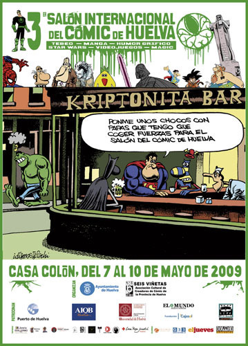 Horario de 10 a 14 h. y de 18 a 21 h. Stands de librerías (Sala Cien) Talleres (Jardines y Patio de las Bolas, todo el día): Chapas, Globoflexia, Origami, Cómic e Ilustración, Plataforma de Baile, Videojuegos, Croma, Pintura Warhammer, etc... 11 h: Presentación del III Salón Internacional del Cómic de Huelva. viernes 8 de mayo Horario de 10 a 14 h. y de 18 a 21 h. Stands de librerías (Sala Cien) Talleres (Jardines y Patio de las Bolas, todo el día): Chapas, Globoflexia, Origami, Cómic e Ilustración, Plataforma de Baile, Videojuegos, Croma, Pintura Warhammer, Coloreables, Maquillaje, etc... 11 h: Conferencia (Salón Rojo) - “El cómic como medio de comunicación: aplicaciones didácticas”, por Ciro Macías, periodista y guionista y dibujante de cómics. 12 h: Demostración en vivo de viñetas de humor gráfico realizadas por ordenador, por Martín Favelis (Salón Rojo). De 18 a 21 h.: Concurso de disfraces (Jardines) De 18 a 21 h.: Juegos entre cómics (Juegos de mesa). 18 h: Conferencia (Salón Rojo) - “Star Wars: en una galaxia muy lejana...”, por Alicia Mariño, Profesora de Filología Francesa de la UNED. 19 h: “El universo de Tintín”, por Luis Alberto de Cuenca, Profesor de Investigación del CSIC. Ssábado 9 de mayo Horario de 10 a 21 h. Stands de librerías (Sala Cien). 13:30 h: Entrega de Premios Profesionales del III Salón Internacional del Cómic de Huelva. Firmas de dibujantes invitados en el stand de la Asociación Cultural Seis Viñetas (Sala Cien). Talleres (Jardines y Patio de las Bolas, todo el día): Chapas, Globoflexia, Origami, Cómic e Ilustración, Plataforma de Baile, Videojuegos, Croma, Pintura Warhammer, Coloreables, Maquillaje, Escuela Jedi, combates de gomaespuma, cosplay, karaoke, etc... 18 h: Concurso de Mario Kart (Nintendo DS). 19 h: Presentación del cómic Pablo Neruda y sus amigos, a cargo de sus autores Miguel Ángel Alejo y Rodrigo Aguilera (Salón Rojo). domingo 10 de mayo Horario de 10 a 14 h. Stands de librerías (Sala Cien) Talleres (Jardines y Patio de las Bolas): Chapas, Globoflexia, Origami, Cómic e Ilustración, Plataforma de Baile, Videojuegos, Croma, Pintura Warhammer, Coloreables, Maquillaje, Escuela Jedi, Combates de gomaespuma, Cosplay, Karaoke, etc... 13 h: Entrega de Premios de Concursos del III Salón Internacional del Cómic de Huelva. stands (sala cien) Visi Cómics, Librería Guillermo, El Baluarte, Raccon Games, Astria, Biblioteca Pública Provincial, Hollywood Posters y Asociación Cultural Seis Viñetas. invitados -Pachi Idígoras (Humorista gráfico) -Luis Alberto de Cuenca (Profesor de Investigación del CSIC) -Kenny Ruiz (Dibujante de cómics) -Martín Favelis (Humorista gráfico) -Miguel Ángel Alejo (Periodista especializado en cómic) -Alicia Mariño (Profesora de Filología Francesa de la UNED). -Rodrigo Aguilera (Dibujante de cómics). exposiciones (salón iberoamericano) PASCUAL, MAYORDOMO REAL: La revista El Jueves y el periódico El Mundo acogieron a este personaje de Idígoras y Pachi y a sus secundarios, que se parecen a cierta familia... PLATERO Y YO: Seguimos con Idígoras y Pachi, que nos presentan esta versión ilustrada del célebre libro escrito por el moguereño universal. ¡IMPORTANTE! Una parte de esta exposición se encuentra en el vestíbulo del IES La Rábida, como invitación a sus alumnos para que vengan a visitar el Salón Internacional del Cómic de Huelva. KENNY RUIZ (Alicante, 1980). Se inició en el cómic en Granada, fundando en 1994 el fanzine Proyecto Cómic. Posteriormente se trasladó a Barcelona para estudiar e impartir clases en la Escola de Cómic Joso, y durante un año realizó ilustraciones para Disney. Profesionalmente comenzó publicando con editoriales españolas como MegaMultimedia y Dude Cómics, para dar pronto el salto al mercado francés con la editorial Paquet. TINTÍN: Exposición colectiva en la que diversos profesionales de reconocido prestigio realizan un homenaje a este conocido personaje que cumple ahora ochenta años. | |||