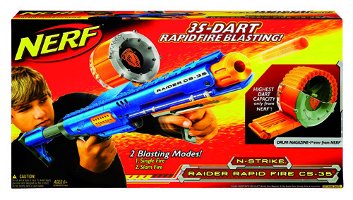 Jugar con Nerf es muy emocionante, divertido y resulta una forma dinámica de mejorar las habilidades psicomotrices. Los lanzadores realizados en foam, funcionan de un modo sencillo. ¡Nadie puede resistirse! Imaginación y destreza son las cualidades que se necesitan para ser un buen jugador. Concentración, equilibrio y buena puntería son las claves para salir vencedor. Además supone una buena dosis de ejercicio que viene muy bien a jóvenes, adultos y a cualquiera que desee relajarse y pasar un buen rato lleno de emoción. Entre las novedades este año se encuentra Nerf que se presentará el 9 de septiembre a nivel mundial también en España! RAIDER CS-35 (+6 años) Sencillamente impresionante por su aspecto, su potencia de disparo y sus accesorios. Este espectacular lanzador Nerf dota de un control total del juego gracias a sus dos modos de lanzamiento de dardos: único o masivo. Su llamativo tambor transparente tiene una capacidad de hasta 35 dardos, que son compatibles con la Recon CS-6. | |||