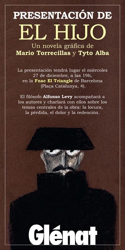 El Hijo, la novela gráfica de Mario Torrecillas y Tyto Alba, repite presentación. Os invitamos a todos a pasar el miércoles 27 de enero, a las 19h, por el forum de la Fnac El Triangle de Barcelona. El filósofo Alfonso Levy acompañará a los autores para charlar de los temas centrales de la obra: la locura, la pérdida el dolor y la redención.