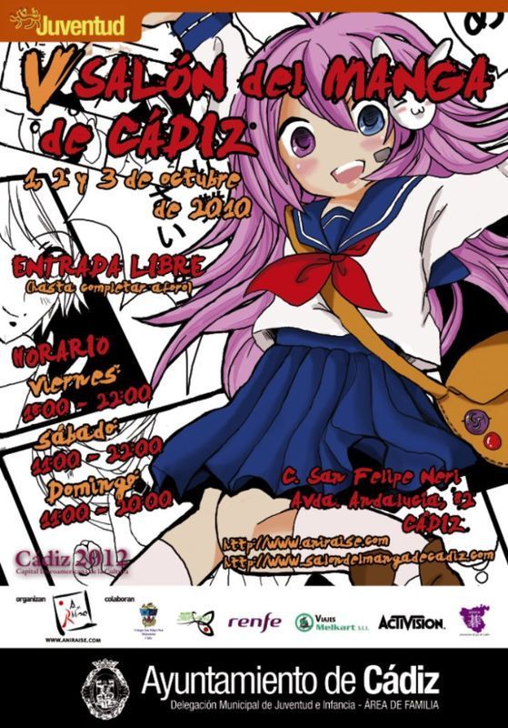 1, 2 y 3 de octubre de 2010. C. San Felipe Neri – Avda. Andalucía, 82 - CÁDIZ. http://www.aniraise.com – http://www.salonmangadecadiz.com Entrada libre (hasta completar aforo). Horario: viernes: 18:00 - 22:00. sábado: 11:00 - 22:00. domingo: 11:00 - 20:00. | |||||