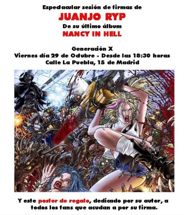 Juan José Ryp firma ejemplares de su obra más reciente (reciente en su nueva versión, aclaro, pues Nancy in Hell empezó a publicarse hace años en Mega Multimedia, donde quedó inconclusa) en Generación-X. Toda la información está en el cartel