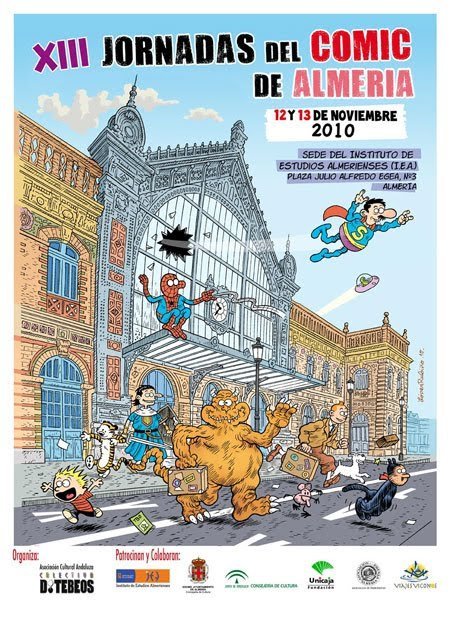 Hemos llegado a trece ediciones consecutivas de una manifestación cultural sobre el mundo de la viñeta, con dignidad y brillantez. ¡Y aún tenemos cuerda para rato! Ha costado lo indecible el recaudar céntimo a céntimo los mínimos importes que hagan posible, con la debida dignidad, esta nueva edición de número maldito, para los supersticiosos, que no para nosotros. Habiendo sorteado escollos, sumando voluntades –ahí están los nombres de los patrocinadores-, y eludiendo maldades, envidias y zancadillas varias. ¿Alguien se creía que el camino continuo de tantos años iba a estar siempre despejado-. Así podemos ofrecer una nueva edición renovada y con bastantes alicientes. Aunar lo clásico y lo moderno, el respeto a la tradición y el alborear de nuevas ideas y planteamientos; el brindar una nueva edición de nuestro prestigioso Certamen Nacional de Creación de Historieta; el servir –en suma- de cita anual para todos los aficionados, coleccionistas y seguidores del lenguaje historieta y sus aledaños, no es poca proeza, aquí y ahora. Si además mantenemos la dignidad cultural del evento, el intento es noble y digno de mayor atención de las autoridades y políticos culturales almerienses. Hay que dar las gracias a los que nos apoyan, reclamar a los que no lo hacen y recibir a todos con los brazos abiertos. Exposiciones: - José López Rubiño de El Jueves a la novela gráfica. - La última aventura de El Jabato por Zanoletty, Fran J. González y Manuel M. Vidal. Y otras visiones de El Jabato. - Greatest Hits. La aventura gráfica de Nacho Molina Parra y Francisco Rico, con Warhammerm, Pahfinder y demás… Publicaciones: - Noveno Arte, por Luis Alberto de Cuenca y Prado. Col. ETC nº 2. De Tebeos Ediciones. - El Jabato. Más allá de la fantasía épica. Coordinación e investigación de Diego Cara. Col. Reflejos nº 4. De Tebeos Ediciones. - Mundos de Papel. II Época. Nº 02- Especial 70 años de Roberto Alcázar. Periodismo y cómic. - Cartel, trípticos, puntos de lectura y calendarios/pegatinas. Invitados: - Luis Alberto de Cuenca. Poeta, ensayista y estudioso del tebeo. - Alfonso Azpiri. Dibujante autor de Mot, Lorna, Zephyd o Historias Húmedas. - José López Rubiño. Historietista y humorista gráfico. Colaborador de El Jueves. Autor de La Canción de los Gusanos. Premio INJUVE 2005. - Nacho Molina Parra y Francisco Rico. Pintores e ilustradores. Especializados en cartas de fantasía e ilustración digital. - Alex Romero. Profesor de Sociología de la UAM. Guionista. Coautor de La Canción de los Gusanos, una novela gráfica editada por Norma en mayo de 2010. Mercadillo de títulos históricos del tebeo: - Publicaciones históricas del Colectivo De Tebeos. - Cuadernillos históricos del tebeo español. - Tebeos populares de los años 80. - Joyas Literarias Juveniles. - Oferta de más de cien ejemplares a precio reducido. - REGALO de un ejemplar de Míster K (Ediciones El Jueves), a todos los compradores, por compras superiores a 6 €. PROGRAMA DE ACTOS Viernes, 12 de noviembre. Sesión de tarde. 18, 30- Inauguración. 19, 00- Presentación de los actos y recepción de los invitados llegados. Con la asistencia de la Delegada de Cultura de la Junta de Andalucía, Director del Instituto de Estudios Almerienses (I.E.A.), representante municipal, de la Fundación Unicaja, de los restantes patrocinadores y de la entidad organizadora. 19, 30- Recorrido por la exposición, dirigido y explicado por los coordinadores y autores presentes. 20, 00- Presentación del libro Noveno Arte, de Luis Alberto de Cuenca. A cargo de Jesús Salazar Amat, filólogo y estudioso del cine y el cómic. 21, 20- Firma de ejemplares. 21, 45- Cierre de la sesión. Sábado, 13 de noviembre. Sesión de mañana. 10, 30- Apertura de puertas. 11, 00- Inauguración del mercadillo y encuentro de los aficionados con los invitados. Paseo explicativo por las exposiciones. 11, 30- Taller demostrativo de ilustración digital, con el procedimiento Wacom, y otros. - Presentación de los jóvenes artistas: Nacho Molina Parra y Francisco Rico Torres. Que mostrarán sus técnicas y explicarán sus trabajos y nuevos proyectos a los aficionados e interesados. Anima y coordina: Carlos Cara Álvarez. 12, 30- Presentación del libro El Jabato. Más allá de la fantasía épica. Coordinación e investigación de Diego Cara. A cargo de Luis Alberto de Cuenca. Con la participación de Fran J. González y Emilio Navarro. 13, 00- Mesa redonda sobre La persistencia de los clásicos del tebeo. Luis Alberto de Cuenca, Alfonso Azpiri y Alex Romero. Modera: Diego Cara. 13, 45- Firma de ejemplares. 14, 15- Cierre de la sesión de mañana. Sesión de tarde. 17, 30- Apertura de puertas del recinto. 18, 00- Mesa redonda: Las salidas actuales de los jóvenes dibujantes, con Francisco Rico, Nacho Molina, Fran J. González y José López Rubiño. Modera: Emilio Navarro. 19, 00- Charla coloquio-entrevista con José López Rubiño y Alex Romero. Presentación de La Canción de los Gusanos, editada por Norma, 2010. Modera: Diego Cara. 19, 45- Presentación de Mundos de Papel, nº 02- - Especial 70 años de Roberto Alcázar. Periodismo y cómic. A cargo de Miguel Ángel Blanco y Diego Cara. 20, 15- Charla coloquio-entrevista con Alfonso Azpiri. Modera: Diego Cara. 21, 15- Entrega de los premios del IV Certamen de Creación de Historietas. 21, 30- Entrega de los Truenos de honor 2010. Firma de ejemplares. 22, 00- Cierre del recinto. Organiza: Asociación Cultural Andaluza Colectivo De Tebeos Patrocinan y colaboran: Instituto de Estudios Almerienses (I.E.A.). Diputación Provincial. Delegación Provincial de Cultura. Junta de Andalucía. Ayuntamiento de Almería. Concejalía de Cultura. Fundación Unicaja Viajes Viconos Asociación de la Prensa de Almería. Moviola Films Notas: Las exposiciones estarán accesibles hasta el 12 de diciembre, en el horario de mañana del I.E.A. (de 9 a 14 horas), los días laborables: de lunes a viernes. Pa
