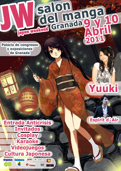 El evento es los días 9 y 10 de abril 2011. La hora de apertura serán las 11:00 y la de cierre las 21:00 el sábado y de 11:00 a 20:00 el domingo. Sábado Escenario 12h - Karaoke Libre 13h - Concierto Yoshisuke - Concierto Yuuki 14h - Concurso ParaPara 16h - Concierto Disaster Vangh 17h - Concurso Cosplay 19h - Concierto Yuuki - Proyecciones Sábado 12h - Evangelion 2.22 14h - La chica que saltaba a través del tiempo 16h - La isla de los Recuerdos y el Espejo Magic 18h - Akira Domingo 13h - Concurso Karaoke 15h - Exhibicion ParaPara 17h - Concierto Yoshisuke 18h - Concierto Yuuki - Proyecciones Domingo 12h - Ghost in the Shell 2.0 14h - Akira 16h - La isla de los Recuerdos y el Espejo Mágico 16h - Proyeccion Sorpresa Invitados Yu-Ki Yu-Ki es a su vez cantante y compositora. Nacida en 14 de marzo en Saitama (Japón), comenzó a tocar en público en las calles de Oyima, en la prefectura de Saitama. Poco después se trasladó al famoso barrio Akihabara donde grabó sus primeras canciones y pudo dar sus primeros conciertos. En agosto de 2009 se puso a la venta su primer disco en solitario, justo antes de un concierto en el Kudan Kaikan. Ha participado en series de televisión, diversos anuncios y otro tipo de bandas sonoras. Tambien ha dado conciertos en el famoso Comiket de Tokyo y en el Japan Expo en París. Esprit D’Air Yoshisuke Suga, cantante del grupo actuara en el evento. Disaster Vangh Disaster vangh esta formado actualmente por Norek (vocal), Dai (bateria), Kirai (guitarra), Are (bajo). Grupo formado en verano de 2006, bajo el nombre de "nyu-shiki", con el que actuaron en distintas ciudades de España: Almería, Granada, Sevilla, Valencia, Barcelona, Canarias... Más información En la web oficial, http://www.salondelmangadegranada.com/ Fuente: Salón del Manga JW Granada | |||