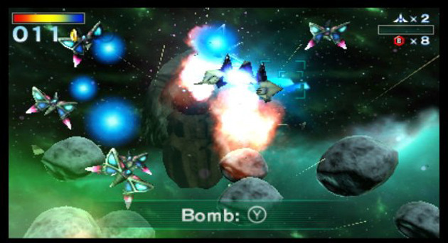 En el modo 3DS, el usuario utiliza el sensor giroscópico para controlar la nave.