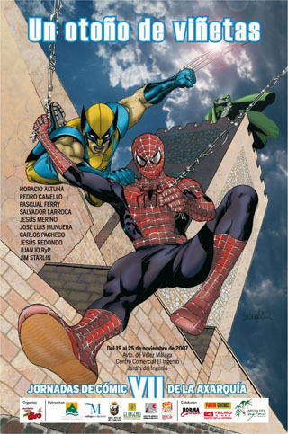 La próxima semana se celebrará en la localidad malagueña de Vélez Málaga la séptima edición de las Jornadas de Cóimic en La Axarquia. De nuevo organizadas por la Asociación Cutural Al Tebeo Vivo, en esta edición se cuenta con la participación de varios autores españoles que triunfan en los mercados internacionales del cómic, como José Luis Munuera, Pasqual Ferry o Salvador Larroca (quien ha realizado el póster que veis aquí al lado), así como dos estrellas americanas de estilos y trayectorias completamente distintas, como Jim Starlin y Horacio Altuna.