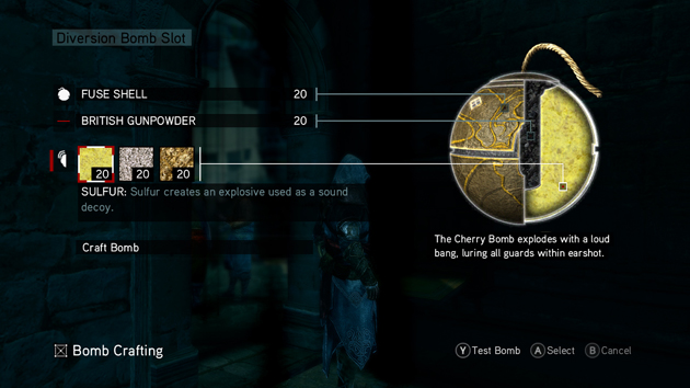“No hay una cantidad infinita de bombas, cada bomba debe ser fabricada utilizando componentes. Los más comunes están disponibles en las tiendas o en las sedes de los asesinos. Otros sólo se encuentran en lugares específicos de la ciudad, o los hallarás robando a los guardias”.