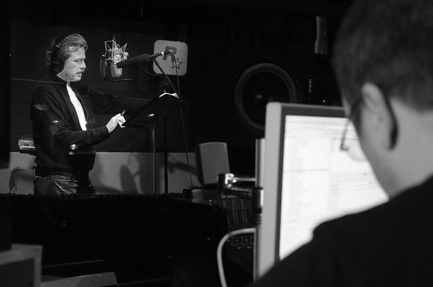 En la siguiente foto, tomada el viernes 9 de marzo de 2012 en sus estudios de sonido de Nueva York, se puede ver al actor James McCaffrey doblando a su alter ego Max: