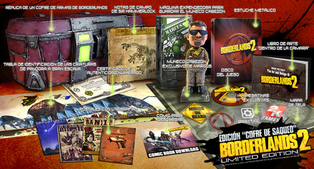 · La edición “El Cazador de la cámara: Collector’s Edition” de Borderlands 2 (con un precio recomendado de 69,99€ en PC y 89,99€ en consolas), incluye una copia de Borderlands 2, un muñeco cabezón exclusivo de Marcus Kincaid, el libro de arte "Dentro de la Cámara", un set de pegatinas, el mapa de Pandora, un cómic digital para descargar y contenido extra descargable para el juego.Añadir Anotación