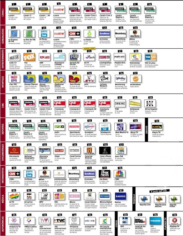 Asimismo las cadenas generalistas se acercan a la franja del 11 al 20, lo que facilitará a los espectadores el acceso a estos canales, mediante un solo mando, con las ventajas que permite la tecnología digital, entre ellas la calidad de imagen y sonido de toda su oferta, así como las prestaciones que facilita la interactividad, entre ellas la consulta de toda la programación en pantalla. Para acceder al nuevo dial de Digital+, los abonados a la plataforma simplemente tendrán que resintonizar su decodificador (terminal) digital. El nuevo dial de Digital+ agrupará en la banda del 1 al 10 a Canal+, C+2, C+...30, Cuatro, los tres canales de C+Cine y de C+Deporte, respectivamente, lo que supone la concentración en esta franja de toda la oferta premium de la plataforma. En la banda del 11 al 20 estarán los canales Generalistas (TVE1, La 2, Cuatro, CNN+, La Sexta, etc…). El género de Entretenimiento, donde se dan cita las series de mayor éxito internacional, se encontrará en la banda del 20 al 29 con Calle 13, Fox, AXN, Paramount Comedy, FDF, Cosmopolitan, P&Arts, Telenovelas, Clan/TVE50. Además, se incorpora en el dial 25 Sci-Fi, un nuevo canal dedicado a la Ciencia Ficción. La oferta infantil continúa en la franja de los 30 con Disney Channel, Disney Ch.+1, Playhouse, Toon Disney, Jetix, Cartoon Network, Boomerang y Nickelodeon, ocho canales para todas las edades que presentan el catálogo de entretenimiento más completo para niños y jóvenes. El cine de estreno y el de todas las épocas se encuentra en la amplia oferta de canales temáticos de Cine que inauguran la franja de los 40 con C+Cine, Cinemanía, TCM, Hollywood, DCine Español. Los grandes acontecimientos deportivos de las principales competiciones se disfrutan en directo a partir del dial 50 con los tres canales de C+Deporte…, Golf+, Sportmanía, Eurosport, Teledeporte, RMadrid TV, Barça TV, Playin’TV. El género documental se agrupa en torno a la franja del 60 con Documanía, Natgeo, Discovery, Viajar, Cocina, Historia, Caza y Pesca y Docu TVE. La pluralidad informativa llega de la mano de los 70 con CNN+, 24 Horas, Méteo, Intereconomía, Bloomberg, Euronews, Fox News y CNBC Europe. Por su parte, todos los estilos musicales se agrupan en la columna de los 80 con 40 TV, 40 Latino, MTV, Vh1, Mezzo, Canal Clásico, Música Digital y Radios. Por último, la oferta de televisiones Autonómicas cierra esta nueva organización ocupando la banda de los 90 con Andalucía TV, TMSat/La otra, TVV Int., TVC Int., TV Galicia, Euskadi TV y TV Canaria). Nota de Prensa | |||