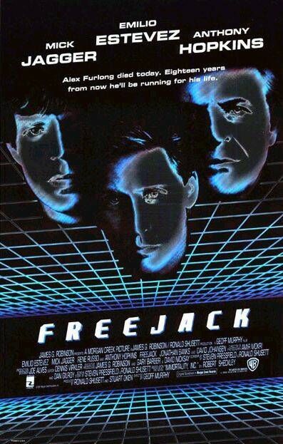 La novela "Inmortality Inc" de Robert Sheckley es llevada al cine con el nombre de Freejack. Historia futurista de un chaval que es lanzado al futuro al estrellarse su coche y que será perseguido por cazarrecompensas del futuro por ser un prófugo en el nuevo mundo futuro. correcto film de accion que entretiene sin más,buenos diseños futuristas, tanto edificios, como coches etc..y el accidente que tiene el Estevez estrellandose en el puente mola. La verdad que es una persecucion villano-prota en el futuro sin tampoco nada espectacular,el perseguidor es Mick Jagger. El cantante de los rolling pone su careto malvado pero vamos,nada más,se le nota que le falta unas clases de interpretación,pero que le vas a pedir al maestro del rock,además su personaje es un poco "empanao" con ese casco que parece un teletubbi y el tiempo que le lleva dar caza al freejack