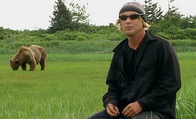 Por otro lado, la impresión que tengo es que se trata de una película bastante tramposa, y me refiero al modo de enfocarla. El intento de que algunas de las escenas más estrambóticas de Timothy (un tío que según lo que nos cuentan repetía hasta 15 veces las tomas) nos parezcan sínceros arrebatos, o el también intento de encajar hechos diversos o hasta contradictorios en el discurso general de la peli (cuando no es oír al propio Herzog declamando en tono cursi lo que pensaba el protagonista o cuál era su filosofía de vida).
