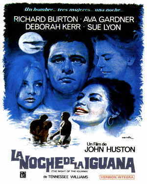 Como suele pasar en las adaptaciones de este autor todo ocurre en un espacio cerrado, asfixiante (casi puedes sentir el calor de México), entre los personajes surjen tensiones y poco a poco se van revelando verdades. La película habla de muchos temas como la fé, el amor, la poesía, el sexo, etc. Richard Burton sobrevive como puede rodeado de alcohól y mujeres... y vaya mujeres. Sue Lyon repitiendo el papel de Lolita que la hizo famosa, Ava Gardner como la viuda amargada y ninfómana (la escena en el mar con los dos guayabos), Grayson Hall como la vieja reprimida (genial la escena en que la Gardner le llama lesbiana pero sin utilizar esa palabra) y Deborah Kerr.